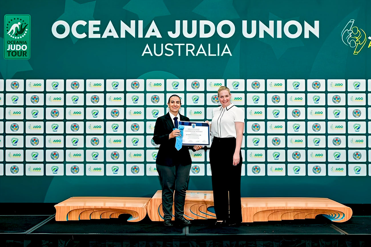 Após ser informada de que obteve o melhor desempenho entre os candidatos à graduação FIJ B na Austrália, Renata Moreira recebe o certificado das mãos de Lubomir Petr, comissário de arbitragem da Oceania Judo Union; Raul Camacho Perez, diretor de arbitragem da FIJ; e Pasquale Chyurlia, secretário da Comissão de Arbitragem da FIJ © Arquivo