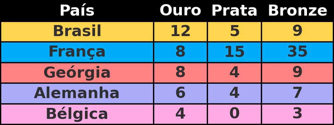 O Brasil soma, até o momento, 12 ouros, 5 pratas e 9 bronzes, enquanto a França ocupa a vice-liderança com 8 ouros, 15 pratas e 35 bronzes. A Geórgia aparece em terceiro lugar, seguida por Alemanha e Bélgica.