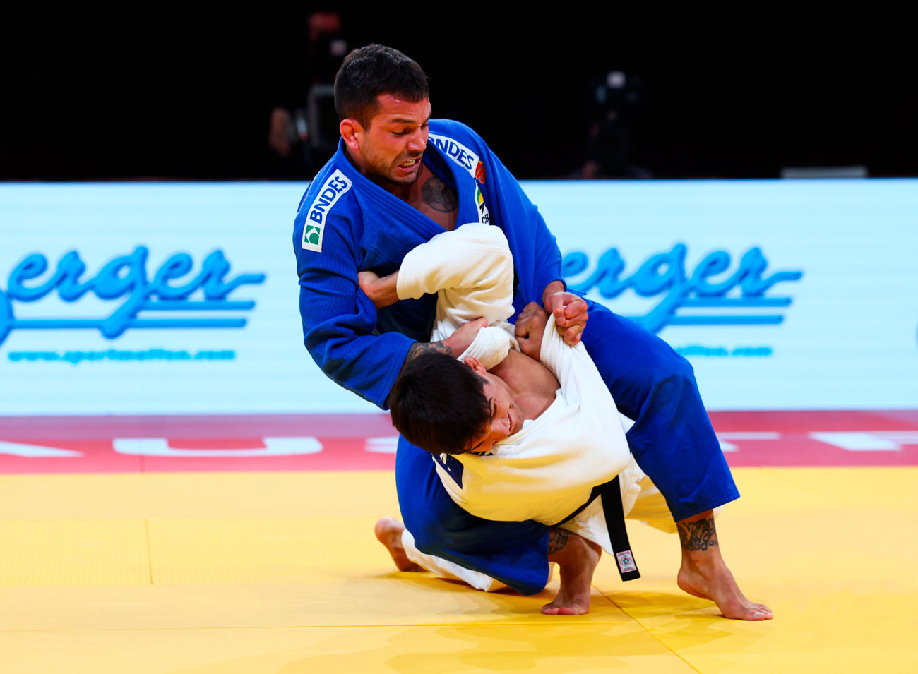 Daniel Cargnin (BRA) enfrenta Guilherme de Oliveira (BRA) na disputa do bronze do peso leve masculino (73kg) no Grand Prix de Linz © Gabriela Sabau / FIJ