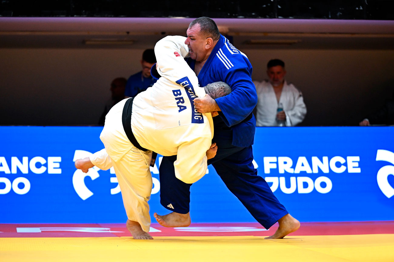 Elton Fiebig encara o georgiano Davitashvili Alexsi na semifinal em Paris, em um duelo de alta intensidade que levou o combate ao Golden Score © Kulumbegashvili Tamara / FIJ