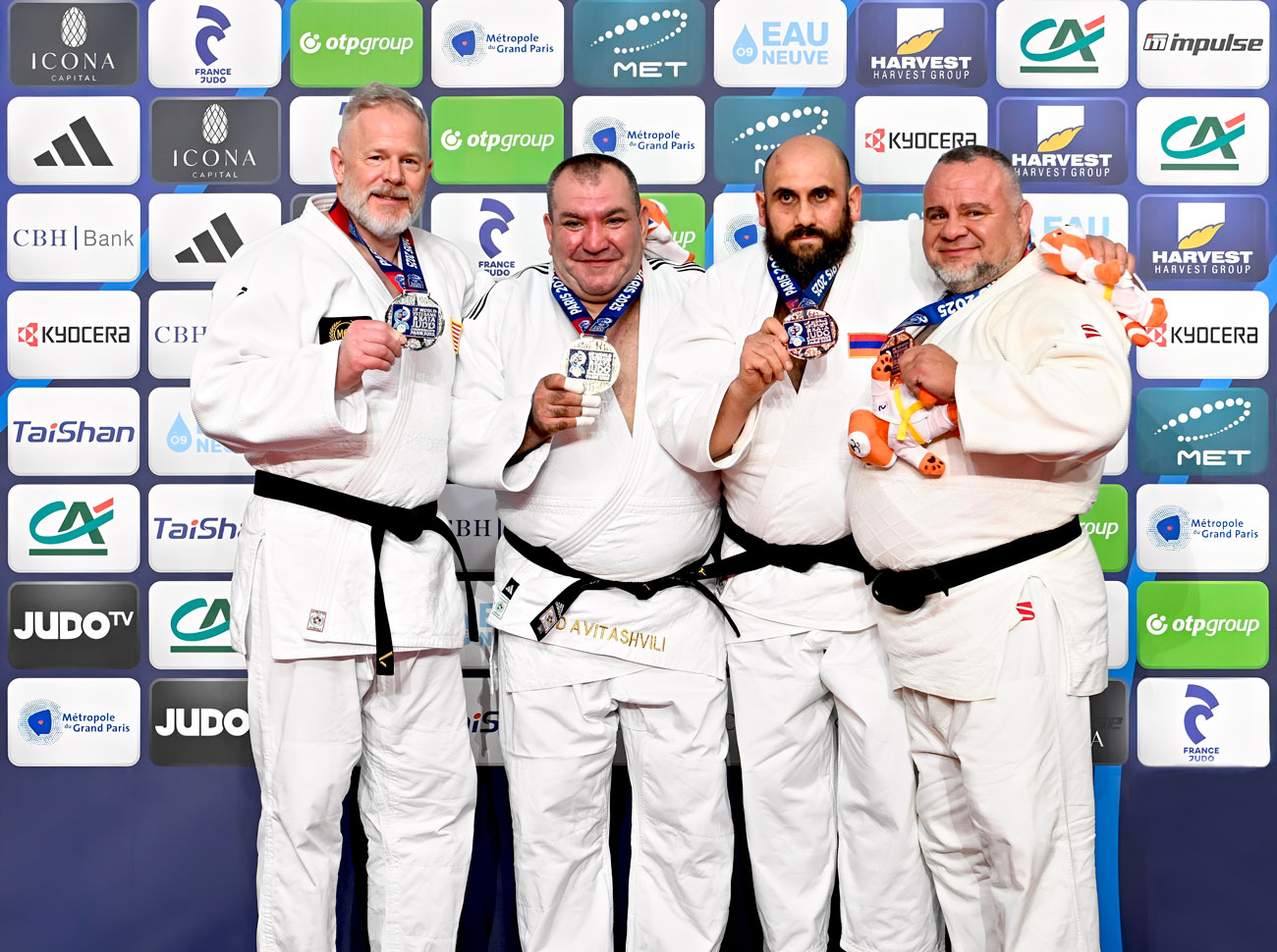 Com excelente domínio das técnicas de ashi-waza, o georgiano Aleksi Davitashvili superou Elton Fiebig na semifinal do Mundial de Veteranos em Paris © Kulumbegashvili Tamara / FIJ
