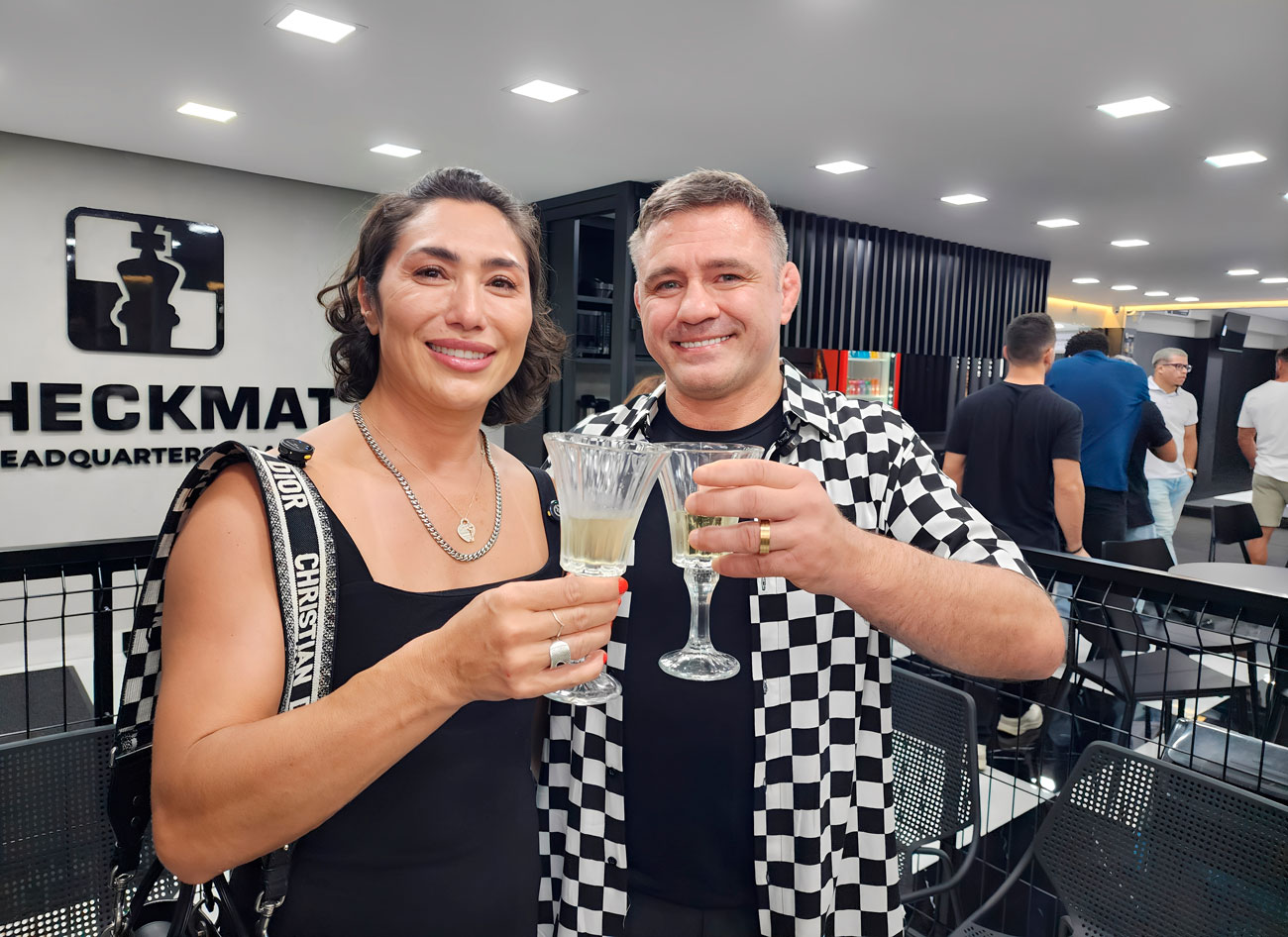 Sebastian e Letícia Lalli em frente ao Checkmat Headquarters Brazil © Global Sports