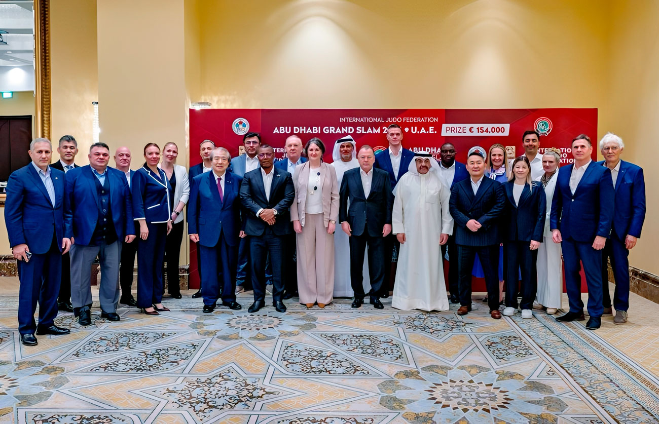 Marius Vizer com a equipe executiva da FIJ e autoridades esportivas dos Emirados Árabes Unidos, durante o Grand Slam de Abu Dhabi 2025 © FIJ