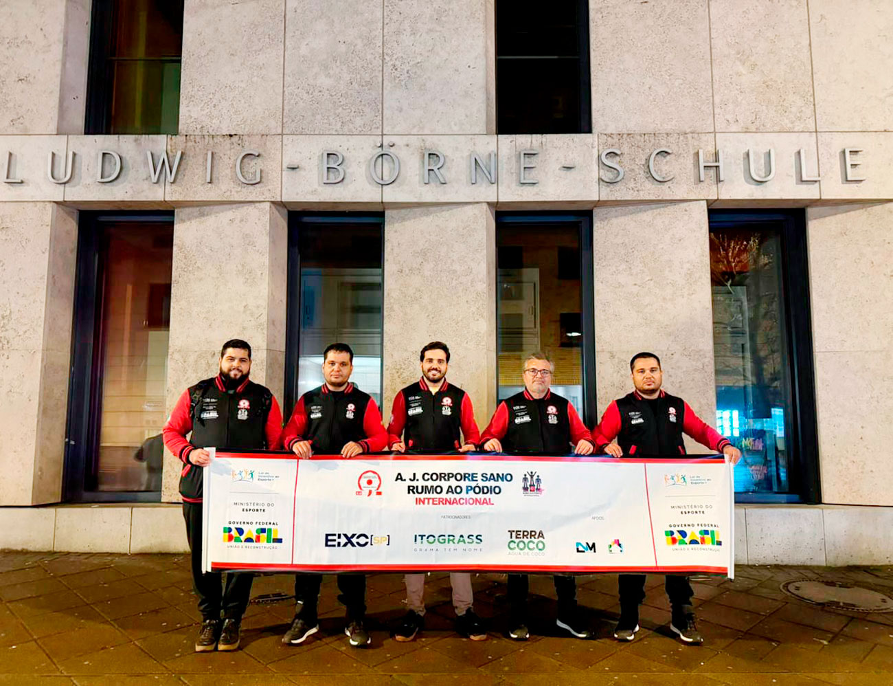 Equipe da Corpore Sano diante do Ginásio de Esportes da Ludwig-Boerne-Schule onde se encontra o Deutscher Judo-Club Frankfurt am Main, o primeiro dojô da Alemanha e atualmente é o mais antigo da União Europeia em atividade © AJCS