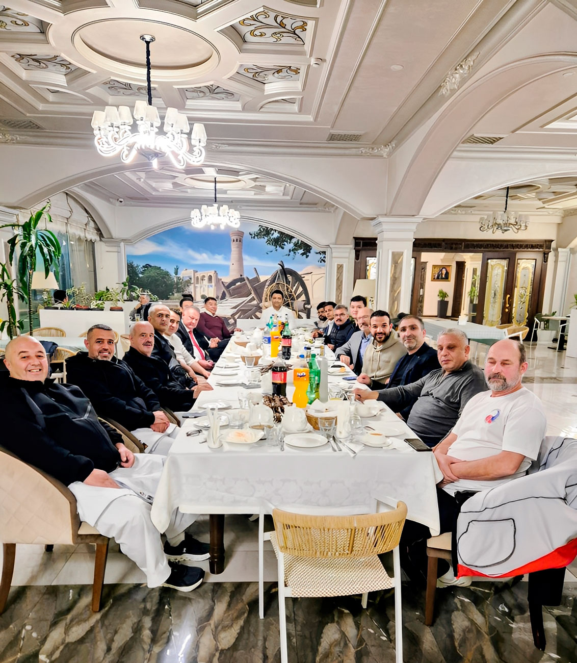 Jantar de confraternização reúne dirigentes da Palestina, Rússia, Índia, Uzbequistão, Armênia, Cazaquistão e Turcomenistão, fortalecendo o diálogo institucional © ITKF Global