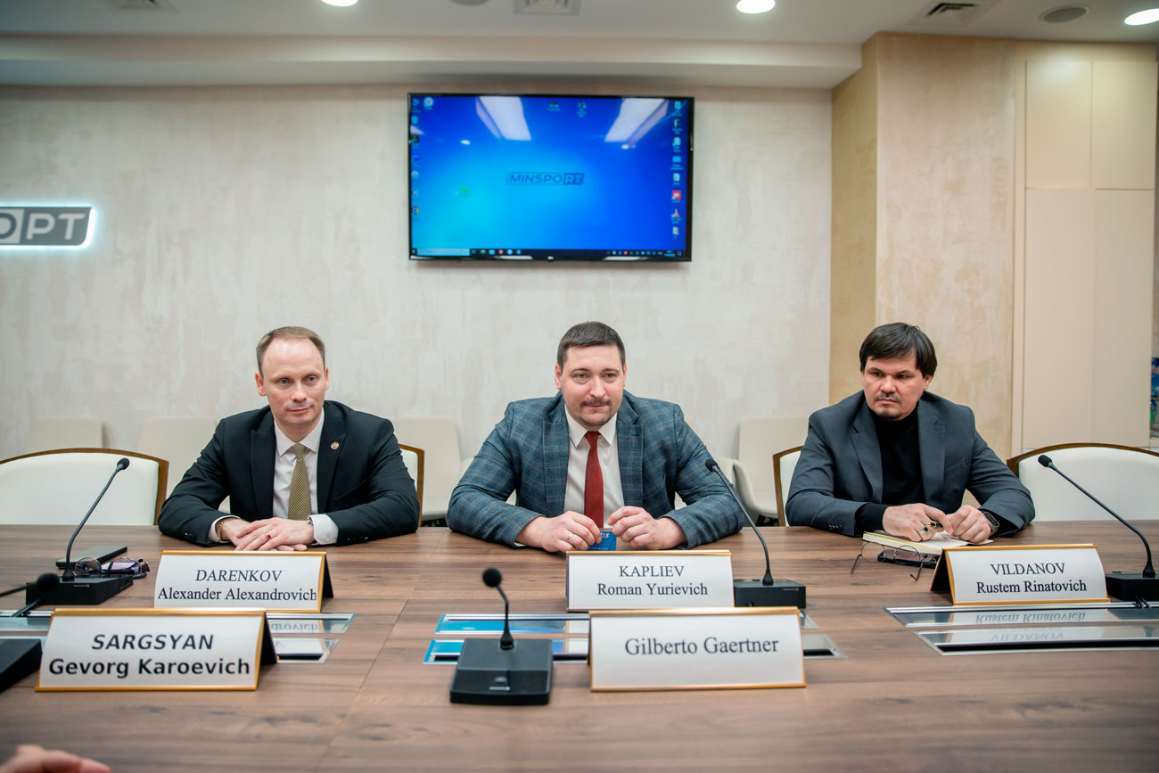 Durante a reunião, o vice-ministro dos Esportes da República do Tartaristão, Roman Yurievich Kapliev, apresentou um panorama das estruturas esportivas da região, com destaque para a cidade de Kazan, reconhecida como um dos principais centros esportivos da Rússia.