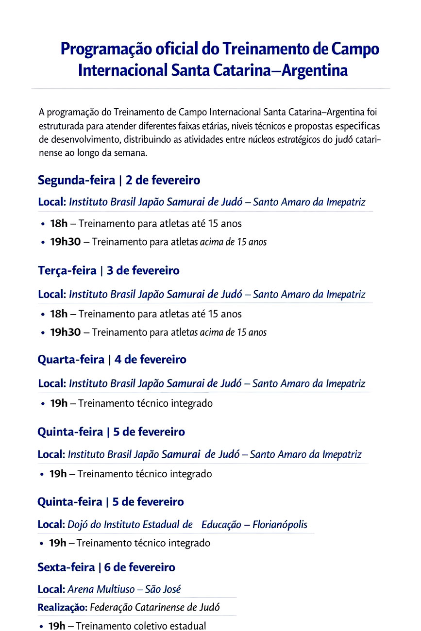 Com apoio da Federação Catarinense de Judô (FCJ) o Instituto Brasil Japão Samurai de Judô promove, entre os dias 1º e 8 de fevereiro, o Treinamento de Campo Internacional Santa Catarina–Argentina, reunindo atletas, técnicos e dirigentes em uma ampla programação voltada ao intercâmbio técnico e ao fortalecimento do judô no Cone Sul.