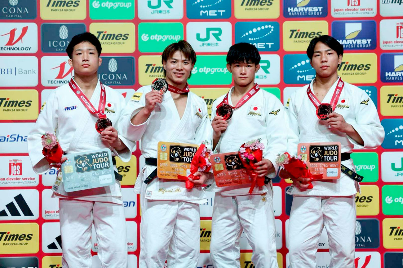 Pódio masculino dos -66kg 100% japonês: Hifumi Abe conquista o ouro, seguido por Kairi Kentoku, enquanto Shinsei Hattori e Takeshi Takeoka dividem o bronze © Gabriela Sabau / FIJ